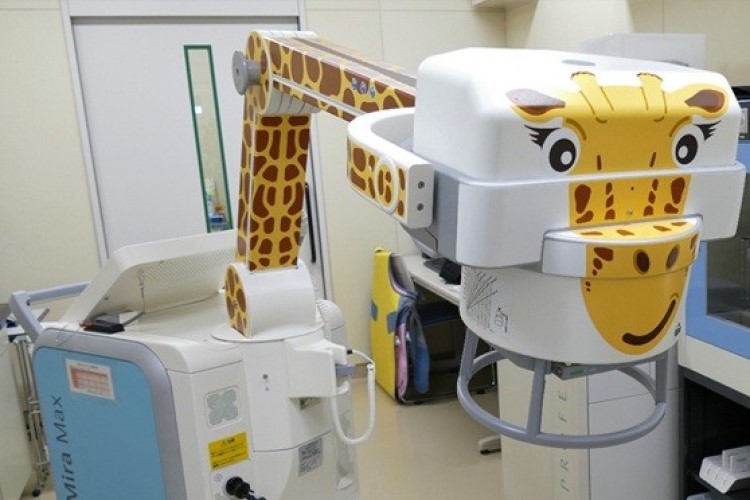 放射線検査室では検査を受けられるお子様やご家族に安心していただけるように、また安全な検査となるように心掛けています。検査室に入るさいの抵抗感を少なくするために、壁や撮影装置には明るく優しい動物のイラストが描かれています。不安や恐怖心を和らげるために、音楽を聞きながら又はDVDを見ながら検査を行う事が出来ます。また、プレパレーション※1を行う事もあります。良い画像をより少ない被ばくで提供する事を目指しています。在籍スタッフは13名で、小児救命救急にも24時間365日対応しています。